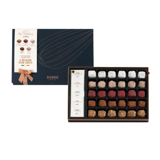 Le coffret Les Trésors de Neuhaus contient 30 pralines gastronomiques. Cinq truffes en chocolat originales créées par des chefs étoilés belges en collaboration avec nos Maîtres Chocolatiers Neuhaus.